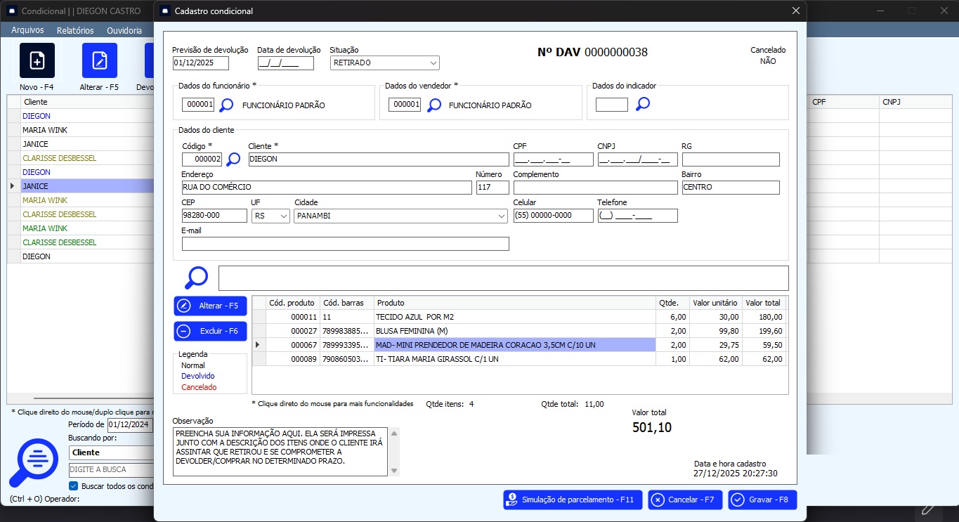 Informativo personalizável na impressão da condicional para o cliente assinar